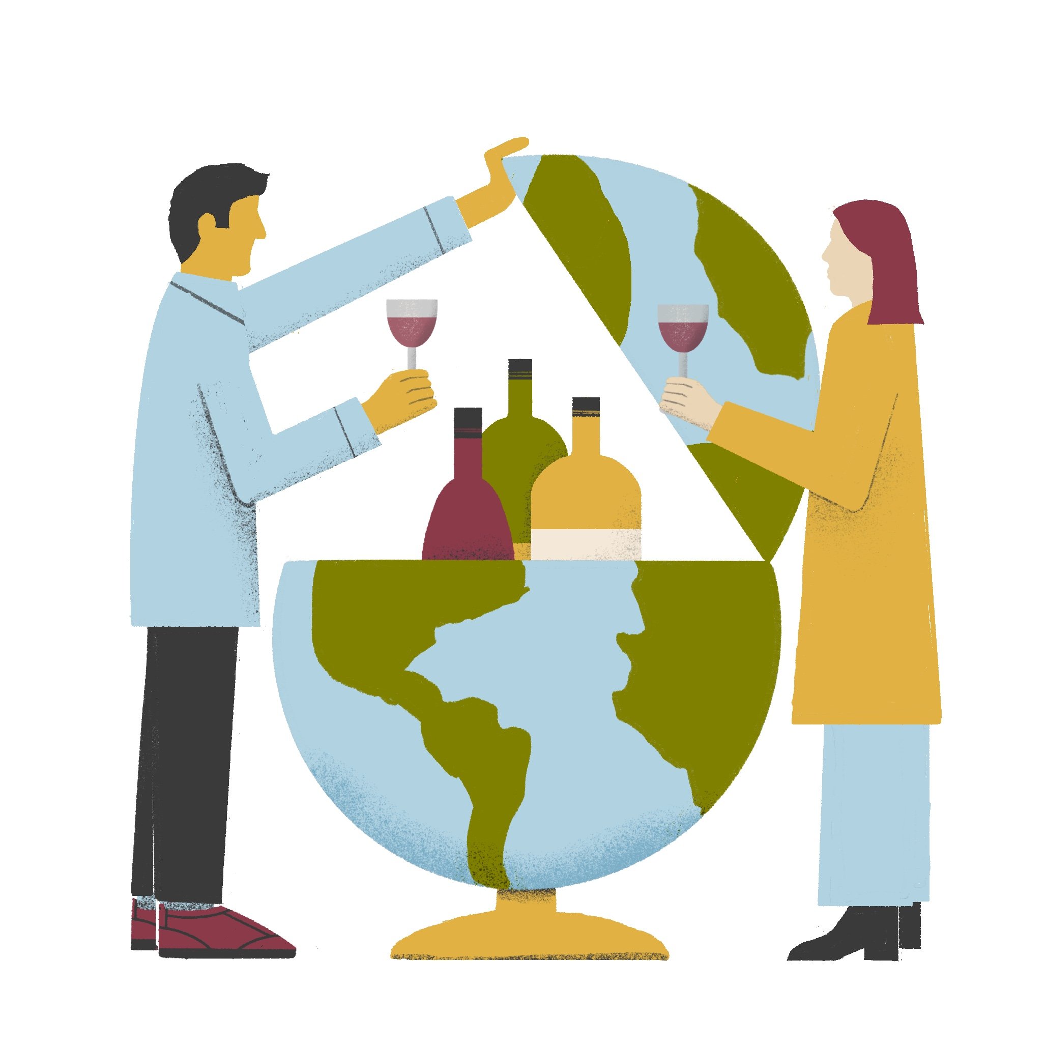 Full-page illustration and article header illustration for a mock brief for Wine Spectator, to accompany an article titled “Passport to Value.” The piece explores the best-value wines from around the world, highlighting the diversity, quality, and stories behind global wine regions